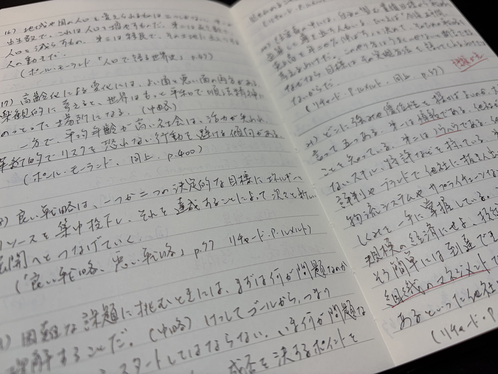 読んだ本で気になった箇所や覚えておきたいフレーズなどを、ノートに書き記していきます。